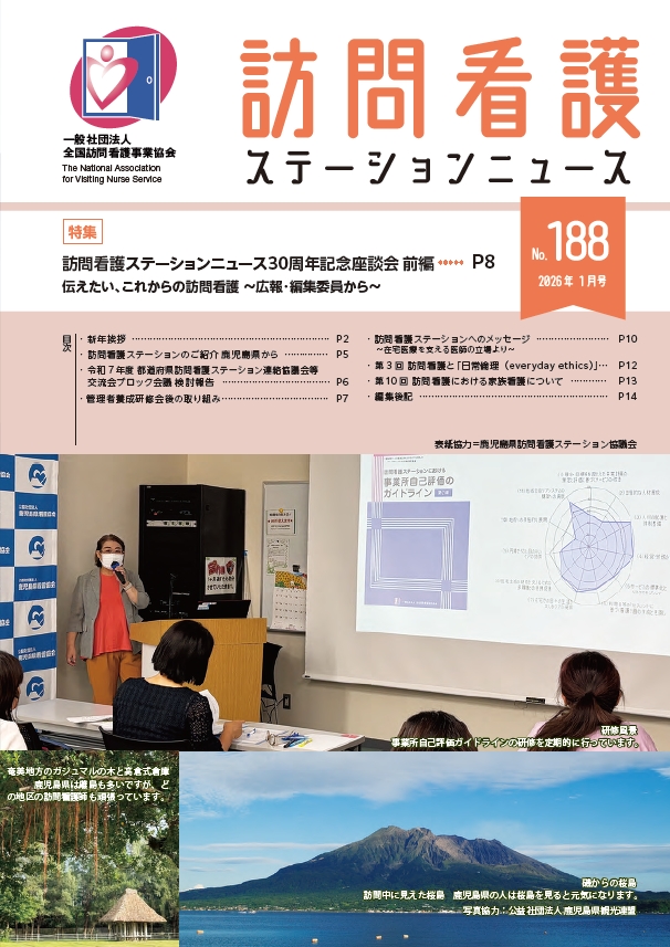 訪問看護ステーションニュース 当協会では訪問看護ステーションニュースを隔月で発行し、会員の皆様にお届けしています。 ※ 当協会WEBページ内に記載されている情報及び画像の無断転載・使用を禁止します。 訪問看護ステーションニュース最新号 クリックすると抜粋ページを読むことができます。 -今号では30周年を記念した座談会前編等を抜粋しています- バックナンバー バックナンバーは会員専用ページからご覧いただけます。 会員専用ページ(会員IDとパスワードが必要です) ▲ページトップへ