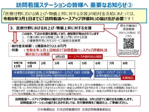 ※本支援事業について、通知や要綱は今後発出される予定ですが、賃上げに対する補助は、ベースアップ評価料の施設基準届出済であることが要件となる方向性が示されています。当該補助申請のご意向がある訪問看護ステーションにおかれましては早期のご対応等ご検討下さい。