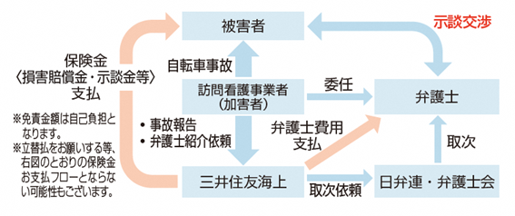 一般社団法人全国訪問看護事業協会(会長:中島 正治、以下「全国訪問看護事業協会」)は、全国訪問看護事業協会を契約者とする会員事業者向け団体保険制度「訪問看護事業者賠償責任保険」において、同保険の幹事保険会社である三井住友海上火災保険株式会社(以下「三井住友海上」)ならびに日本弁護士連合会の日弁連リーガル・アクセス・センター(以下「日弁連 LAC」)と連携し、「自転車事故示談交渉サービス」を提供します。一般社団法人全国訪問看護事業協会(会長:中島 正治、以下「全国訪問看護事業協会」)は、全国訪問看護事業協会を契約者とする会員事業者向け団体保険制度「訪問看護事業者賠償責任保険」において、同保険の幹事保険会社である三井住友海上火災保険株式会社(以下「三井住友海上」)ならびに日本弁護士連合会の日弁連リーガル・アクセス・センター(以下「日弁連 LAC」)と連携し、「自転車事故示談交渉サービス」を提供します。